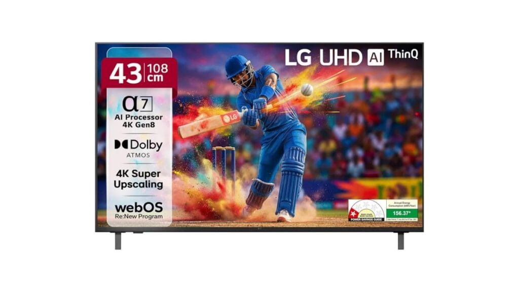 LG UA82 / UR750043″LED / webOS60Hz20W₹28,000 – ₹29,000Smooth OS, AI Features, Viewing Angles