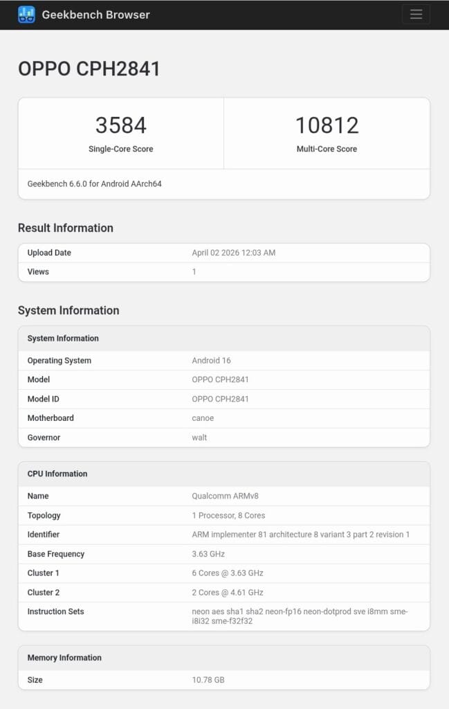 The CPH2841 model has seen a single-core score of 3584 and a multi-core score of 10812 on Geekbench. And with its listing on Geekbench, some specification information has come to light. These scores are almost matching the Snapdragon 8 Elite Gen 5 chipset. Along with the Adreno 840 GPU, Android 16 and 12 GB of RAM, it has been seen.