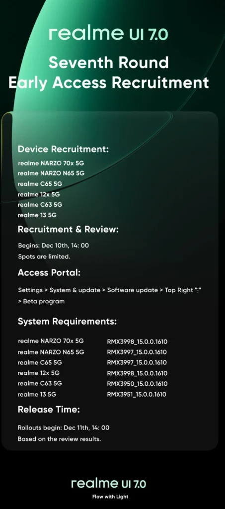 This is the list of devices that will receive the Realme UI 7 update. As you can see, the rollout started on December 10th at 2:00 PM. This rollout is automatic and depends on your system software version for how quickly you receive the update.